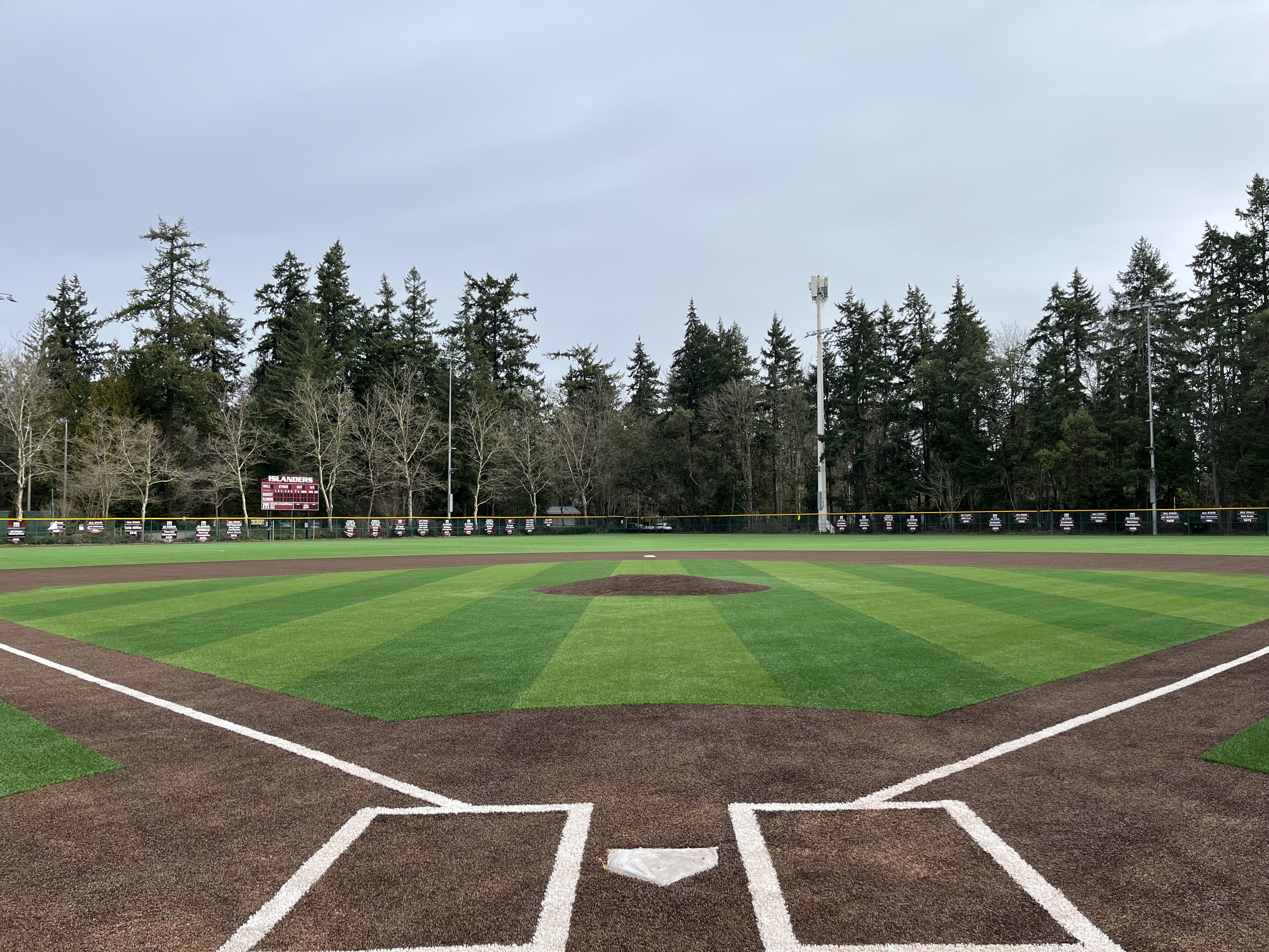 Outdoor baseball/softball facility at Island Crest Park, Mercer Island, WA. Features include natural grass and synthetic turf fields with field lights, batting cage, concession stand, tennis courts, trails, and parking. No specific details about pitching machines or lessons provided.